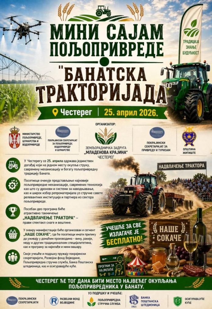 U Česteregu će u subotu, 25. aprila, biti održan prvi mini sajam poljoprivrede pod nazivom „Banatska traktorijada“, koji će okupiti poljoprivrednike, stručnjake i ljubitelje agrara iz čitavog regiona.
